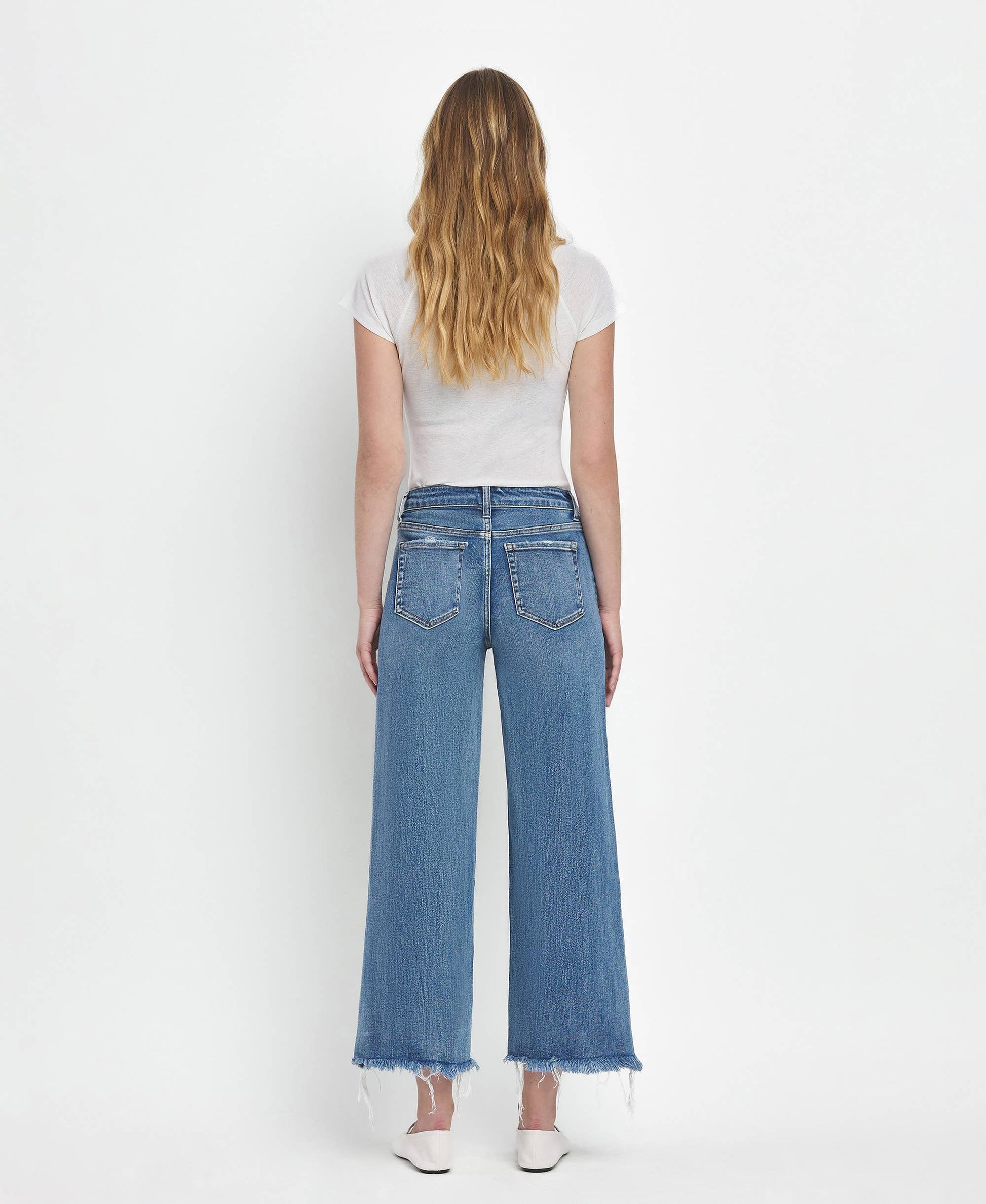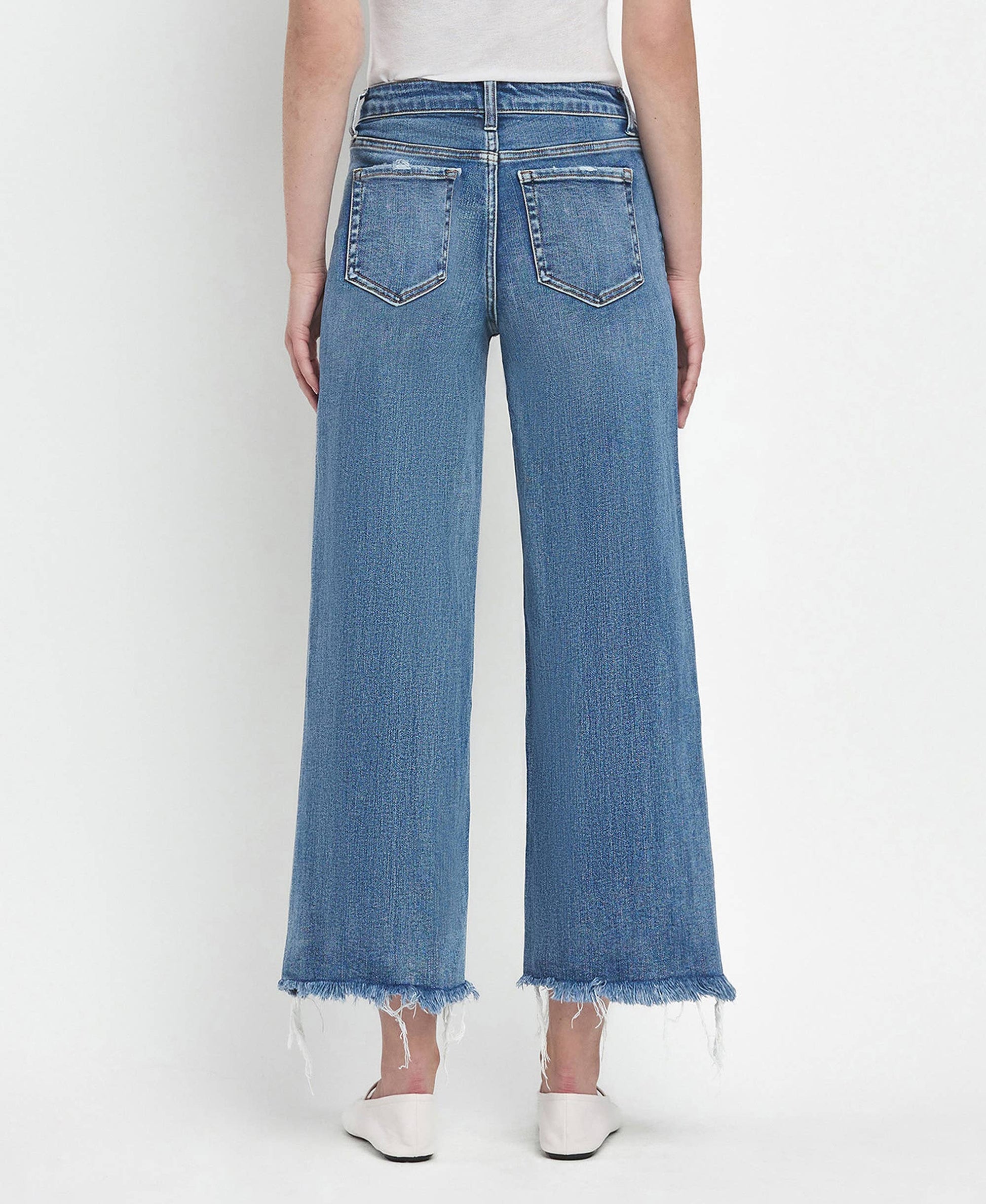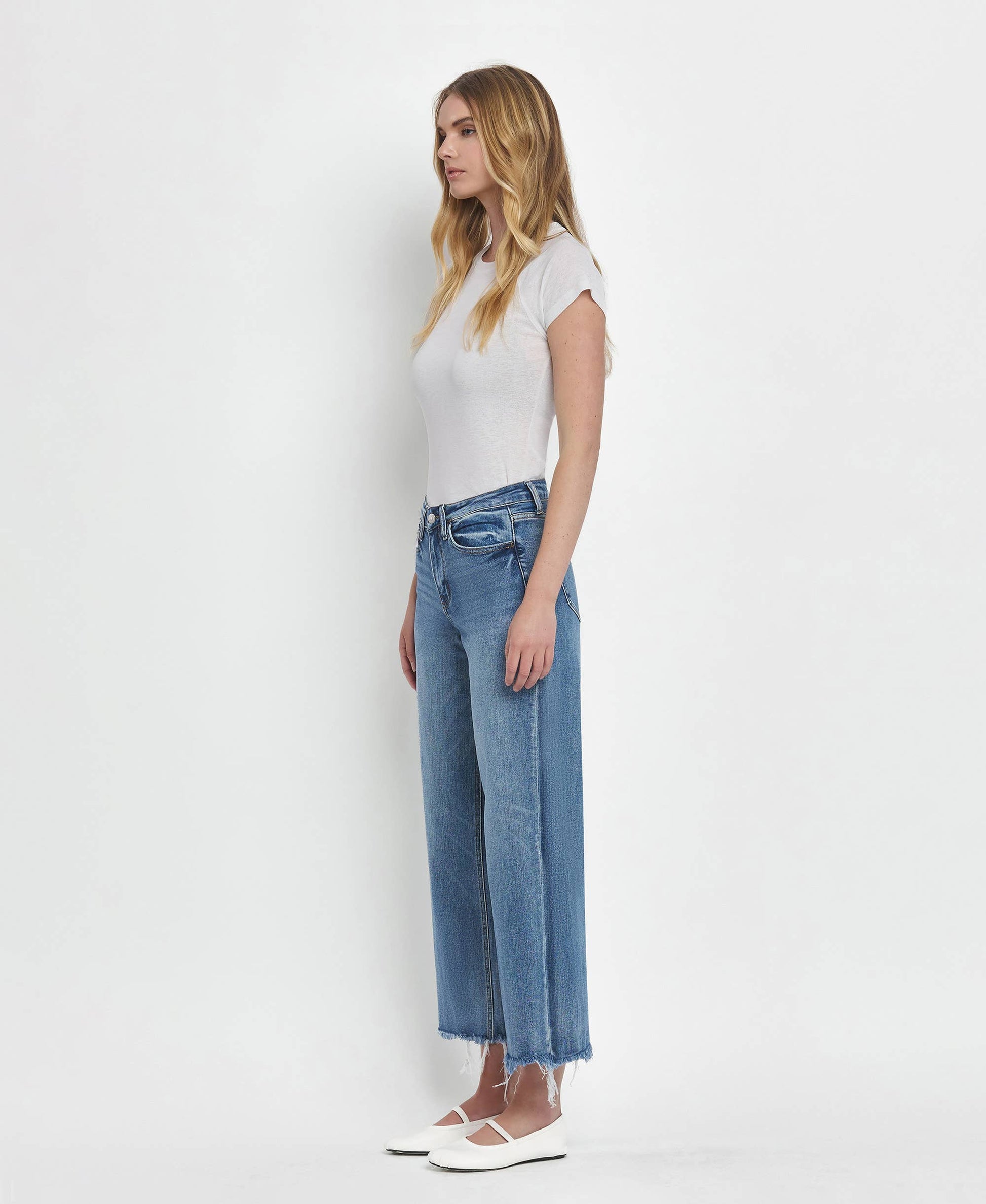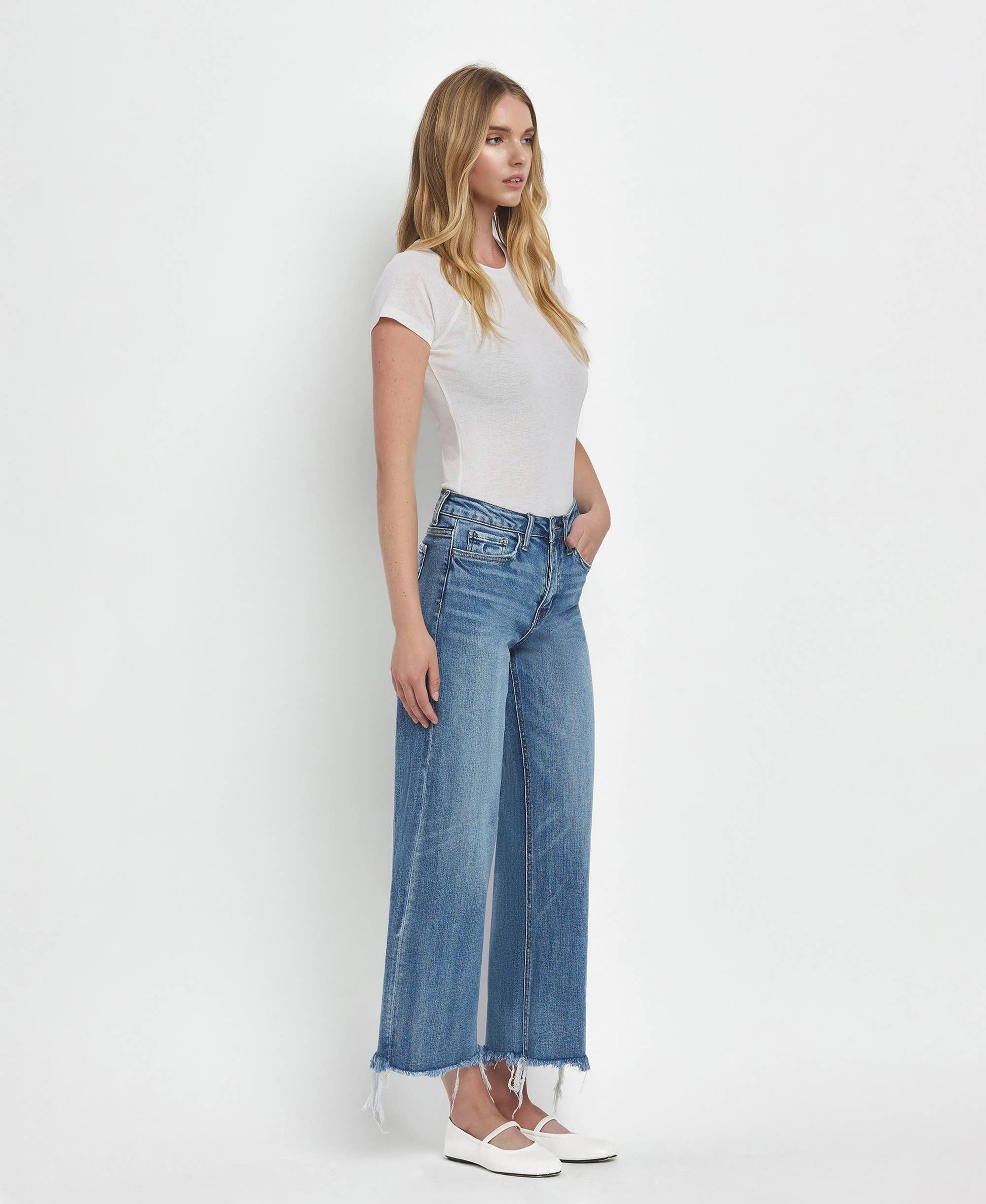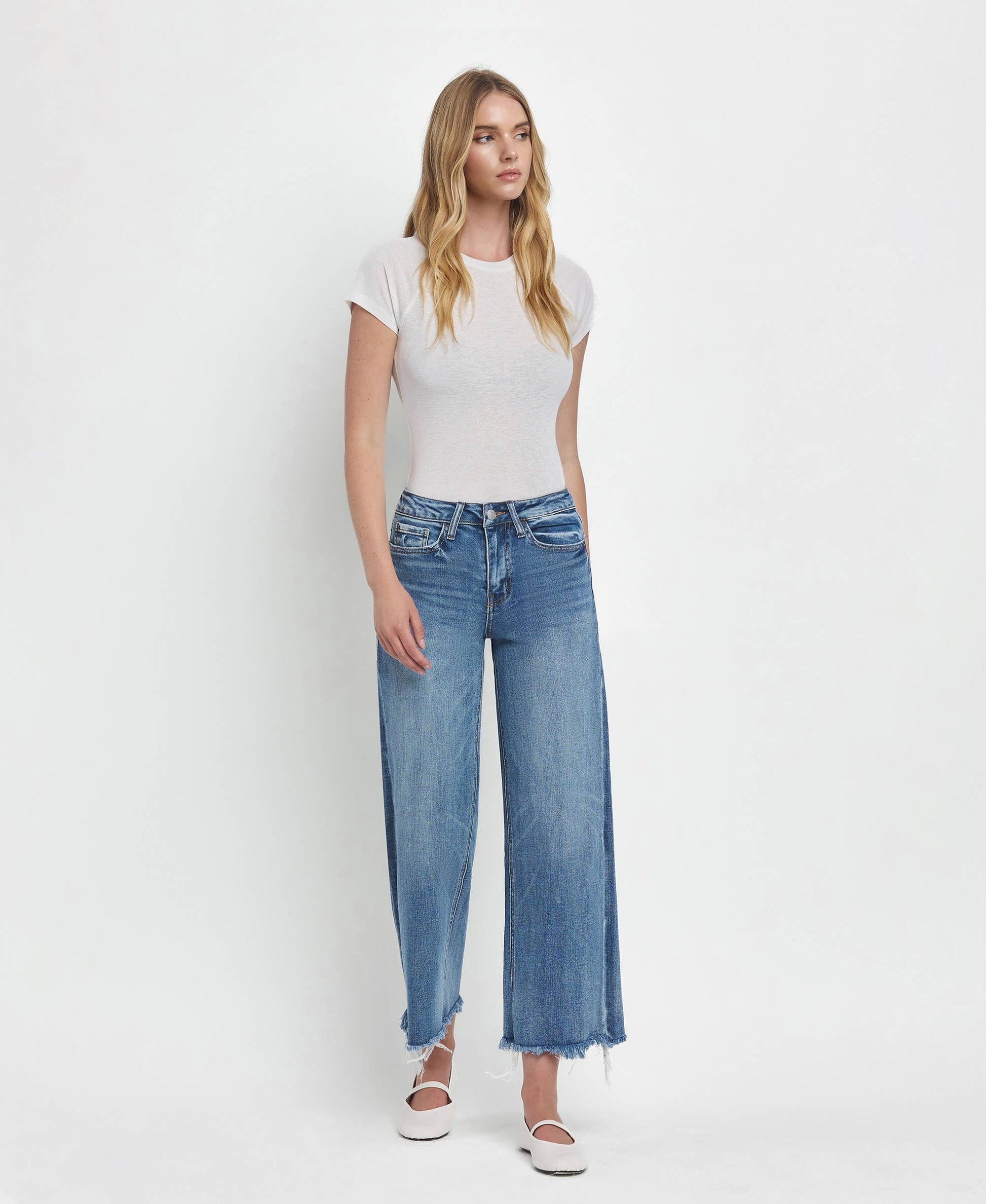 Meet your new go-to denim: the Flying Monkey High Rise Medium Wash Crop Wide Leg Jeans (F5204). Designed in comfort stretch denim, these jeans feature a flattering high-rise waist and a relaxed wide-leg silhouette with a modern cropped length. Lightly distressed details and a frayed hem add just the right amount of edge, while the classic medium wash keeps them endlessly versatile. Finished with a traditional five-pocket design, this pair is easy to dress up or down—perfect with sneakers, sandals, or a statement heel.